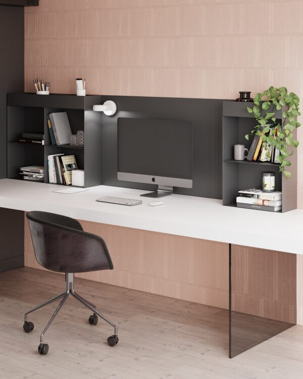 The black and white desk, and black swivel chair, contrast with a light pink wall here. Another thriving plant trails green vines into the mix.