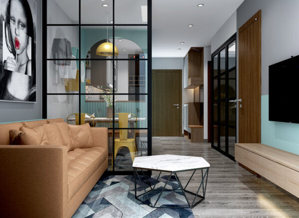 A low room divider has been erected behind the couch, to visually separate the lounge from an adjacent dining area. A cactus mural helps to expand the sense of spaciousness in the living room.