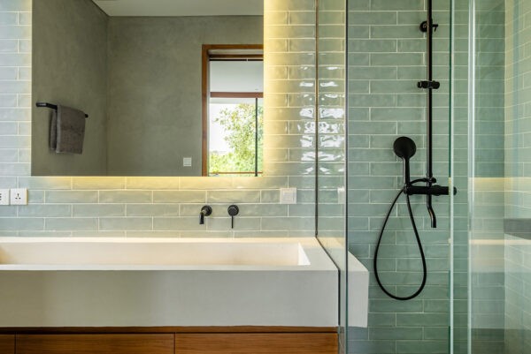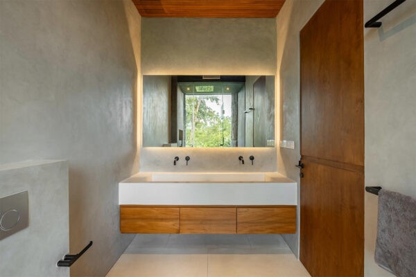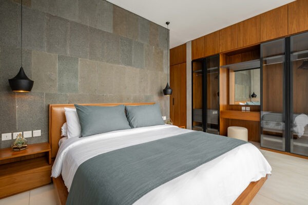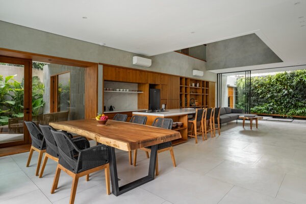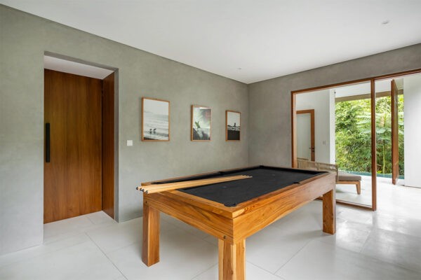 Within the heart of this Balinese villa, a living space unfolds that is as much a part of the outdoors as it is a cozy retreat. Walls of glass stand as silent guardians between the plush comforts of a modern grey sectional sofa and the dense, tropical greenery that seems almost within reach. The contrast between the clean, polished concrete finish on the walls and the lush, vibrant life outside strikes a captivating balance, creating a living picture frame of nature’s art.