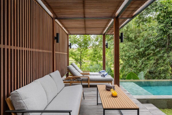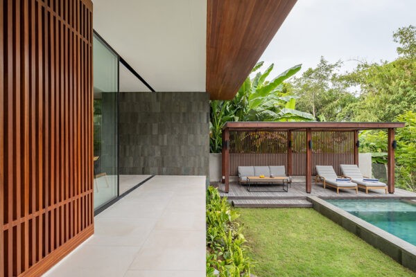 The sleek overhanging roof provides shelter while extending the home into the lush landscape, marrying functionality with an aesthetic appeal. Wood slats offer privacy without sacrificing light, playing a game of hide and seek with the sun’s rays that dance across the water’s surface.