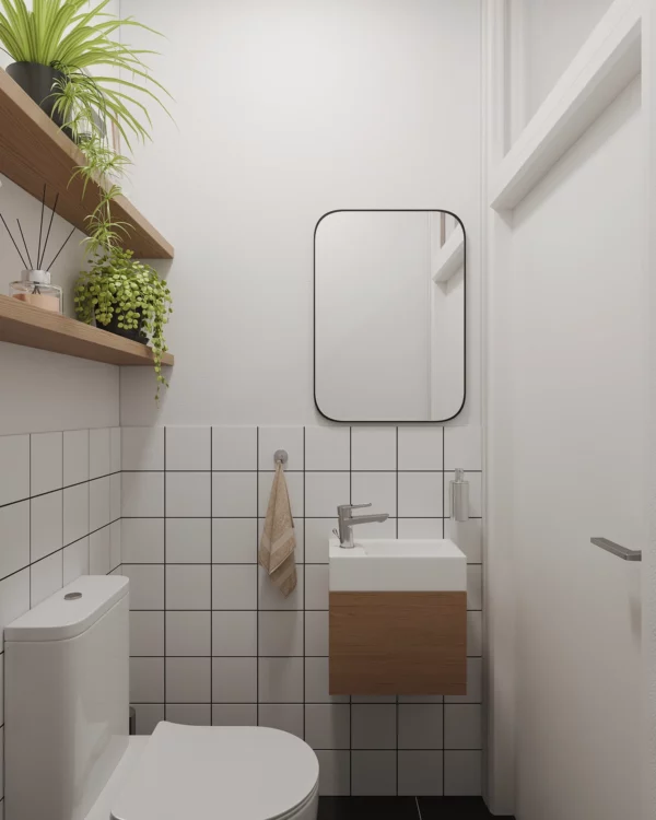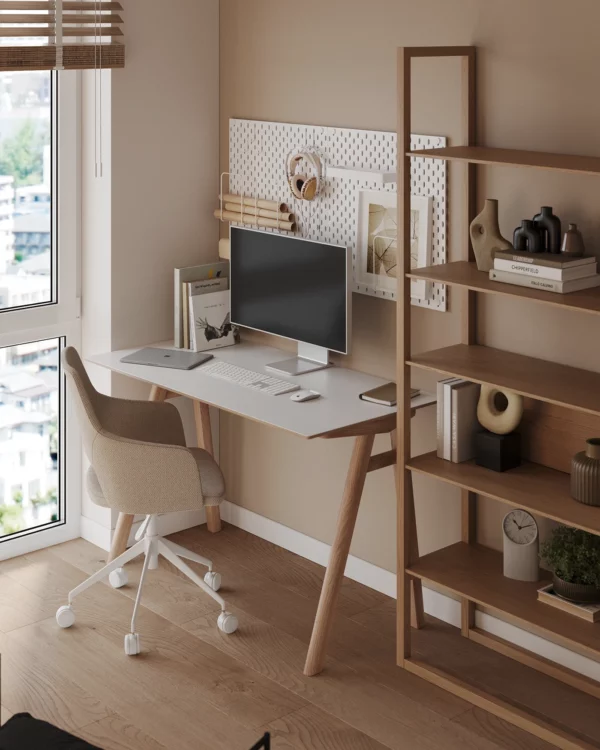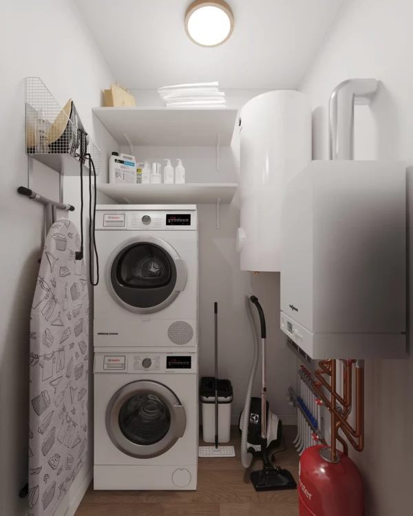 The kitchen is a masterclass in maximizing small spaces. Light wood cabinetry pairs harmoniously with cream-colored countertops, creating a sense of openness and continuity.