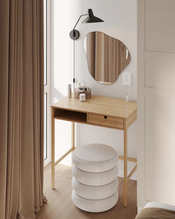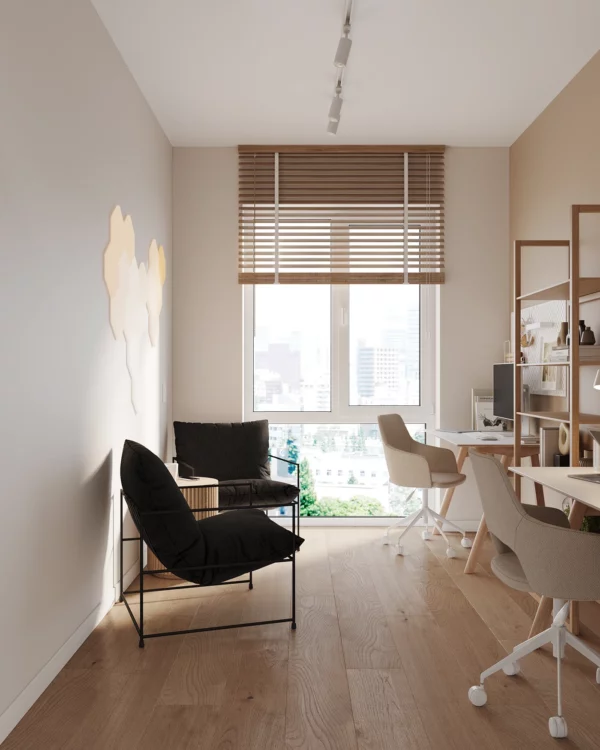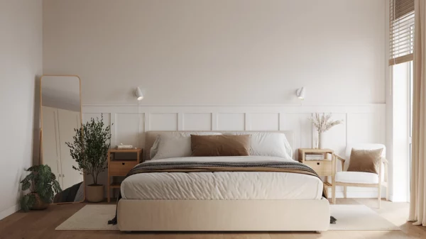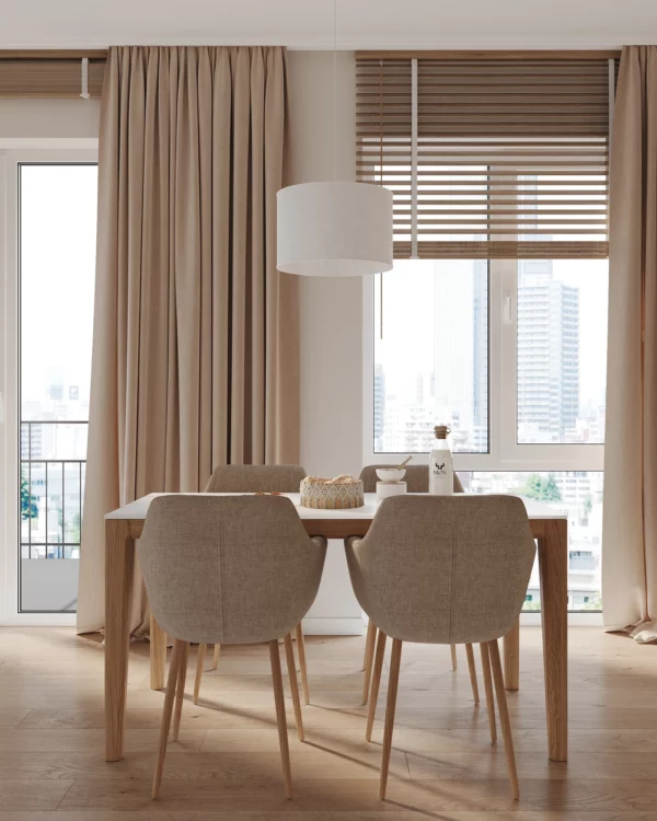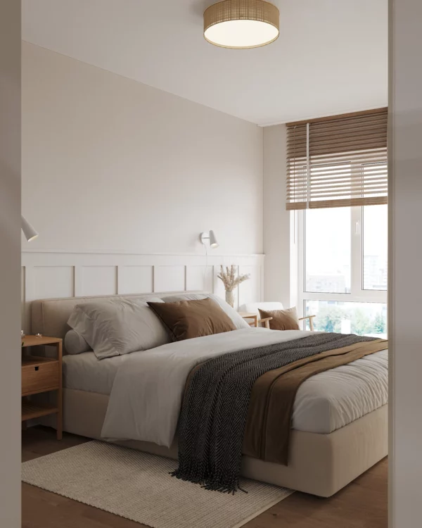 Creamy, soft textiles and minimalistic decor create a restful ambiance, perfect for unwinding after a bustling day in the city.
