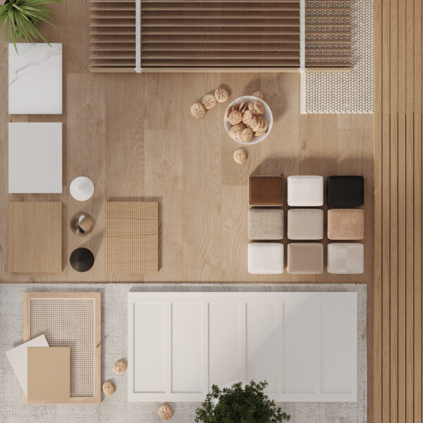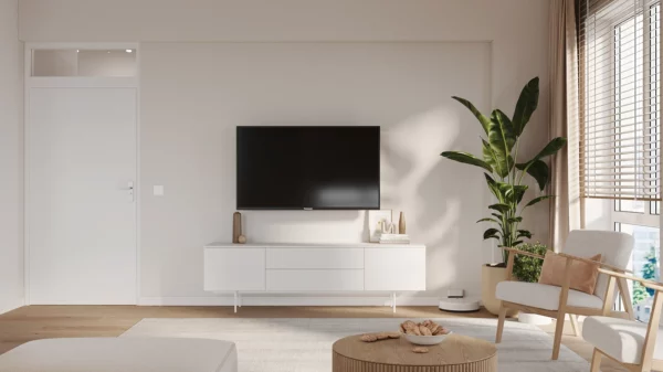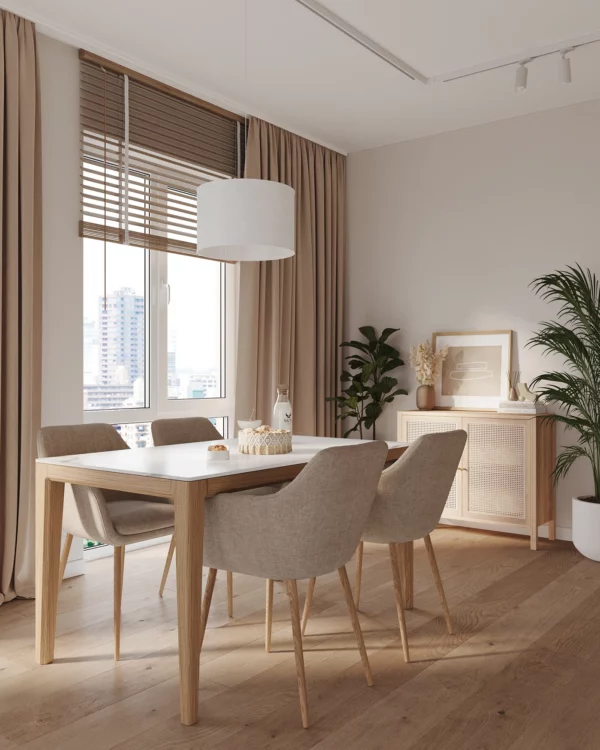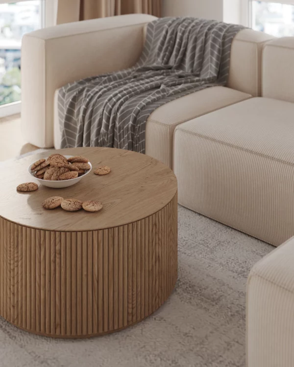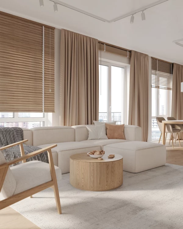 The living room is a sanctuary where soft, natural light dances across creamy sofas, complemented by the organic textures of wood in the blinds and the inviting round coffee table.
