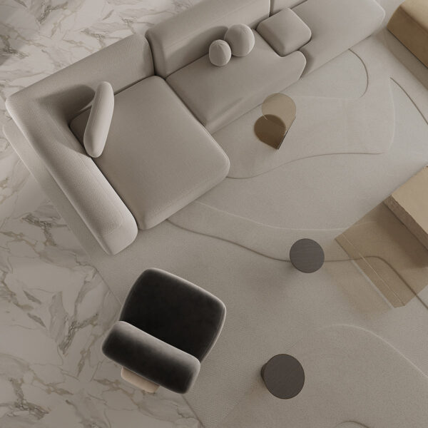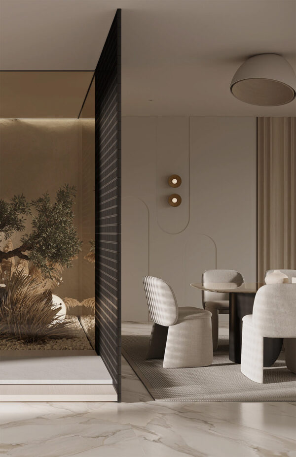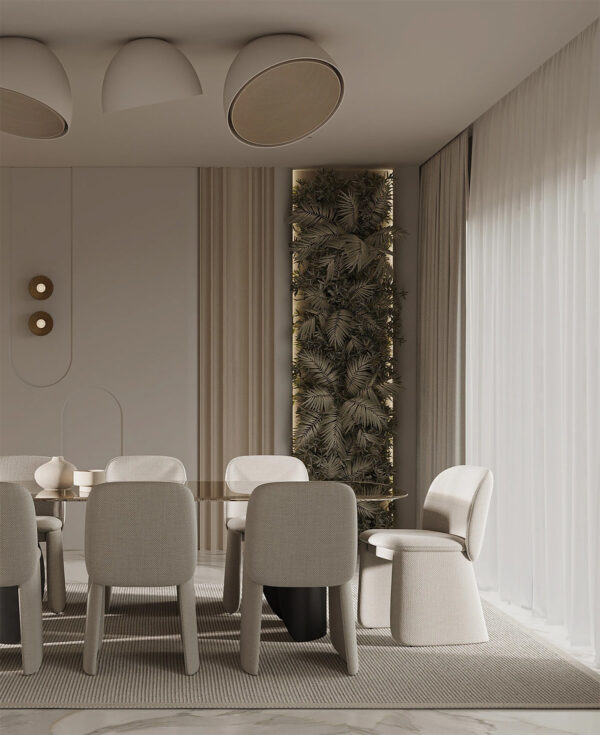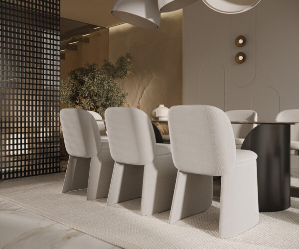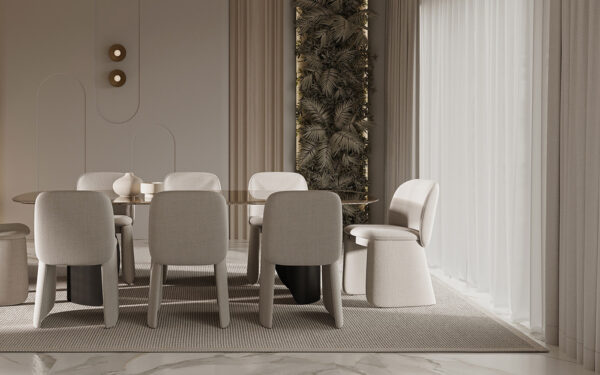 In this dining area, the essence of modern luxury is effortlessly captured. The sleek lines of the chairs and table exude contemporary chic, while the plush textures suggest a welcoming warmth. Marble flooring reflects the room’s natural light, highlighting the space’s clean, geometric lines. It’s a place where meals become occasions, and design meets delight in every detail.