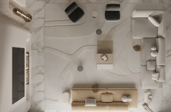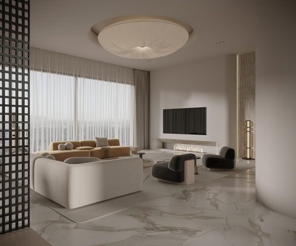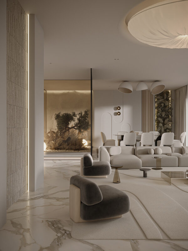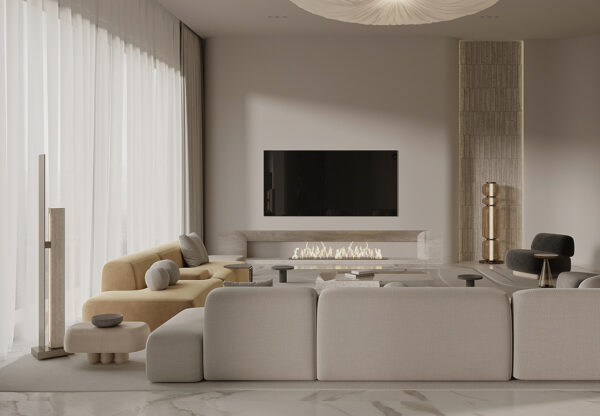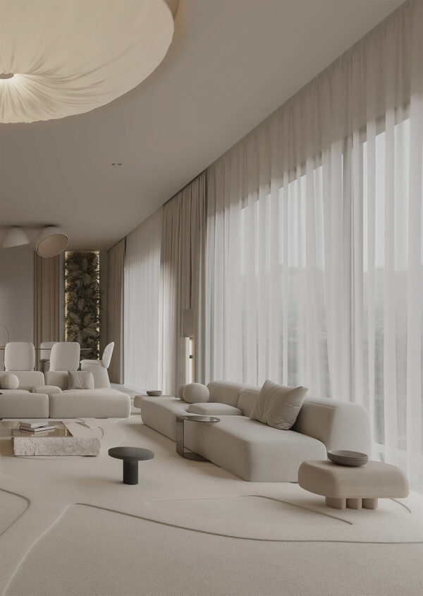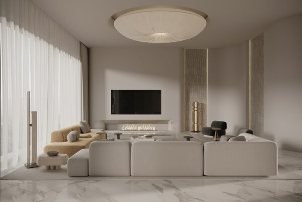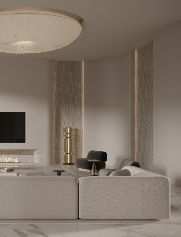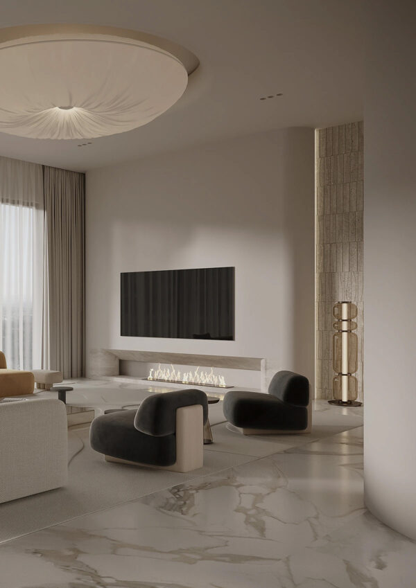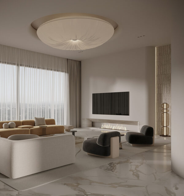 Envisioned with a monochromatic palette, this living room is a symphony of cream and charcoal hues, where each piece of furniture is a standalone artwork. The grand ceiling fixture cascades light like a modern chandelier, enhancing the room’s sculptural quality.