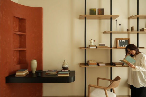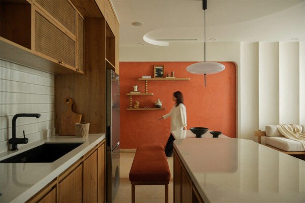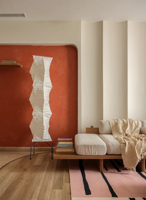 For those who seek a sanctuary where the spirit of the mid-century whispers through modern comforts, behold a living room that embodies this fusion. The robust terracotta wall serves as a warm backdrop to the subtle, organic curves of a sectional sofa that invites relaxation. Artistic flair is evident in the singular, crumpled paper-like floor lamp, its form a playful contrast to the room’s disciplined geometry.