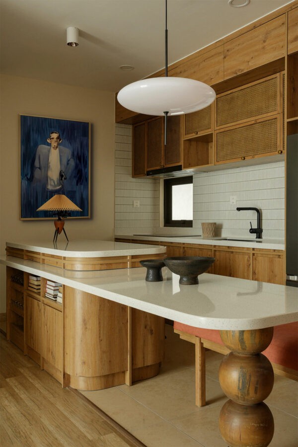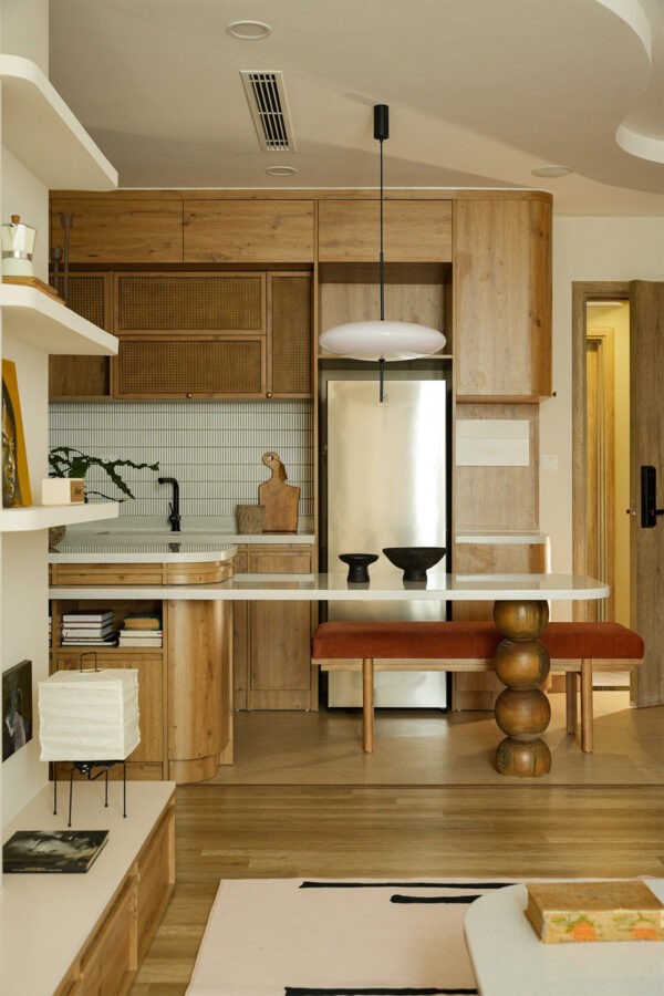 In this culinary corner of the home, the mid-century ethos shines through in the wooden cabinetry’s clean lines and the iconic, sculptural table base—a bold ode to organic forms. A contemporary piece of art injects a vibrant burst of personality, complementing the understated elegance of the beige walls and tiled backsplash.