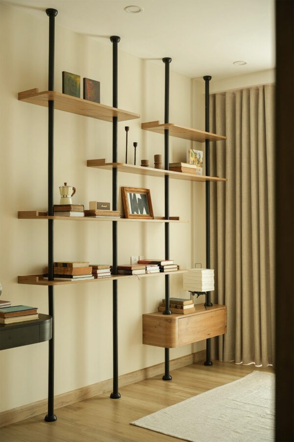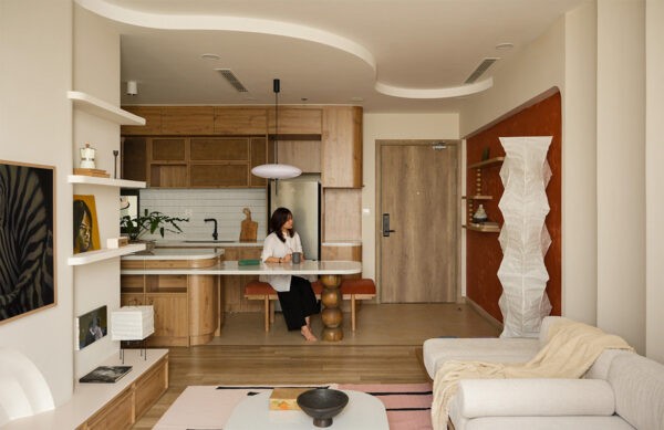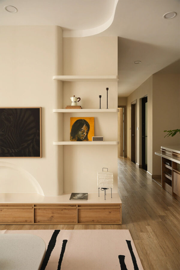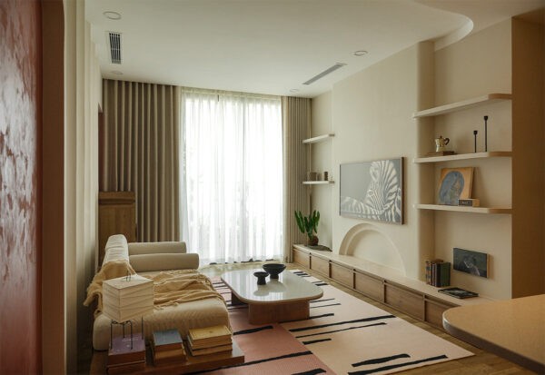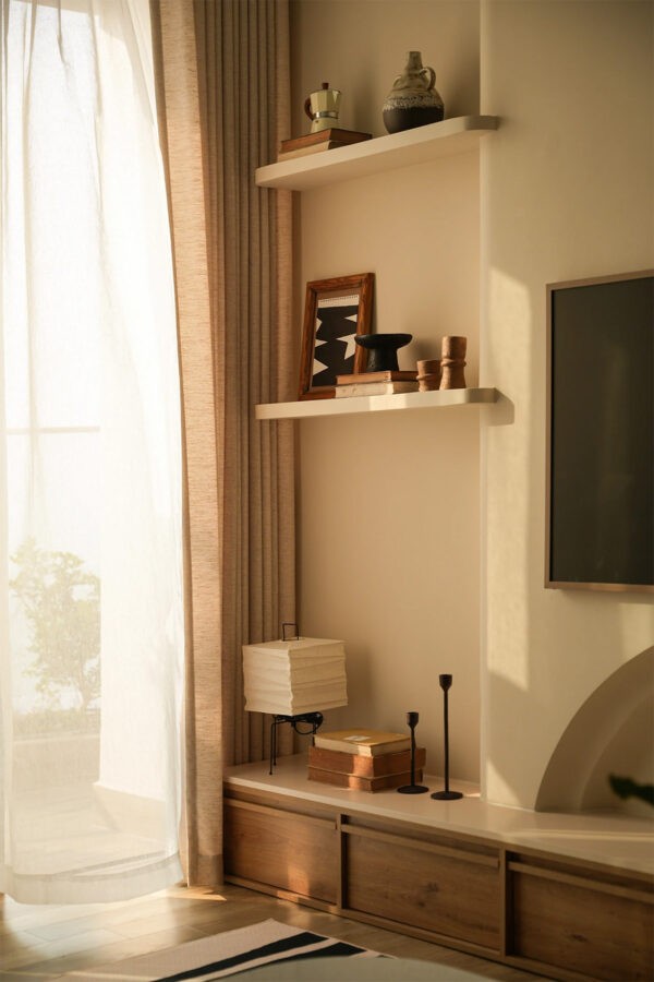 A symphony of neutrals, from the sandy tones of the plush throw to the earthy hues of the wooden accents, creates a serene palette. Anchoring the space is a coffee table whose rounded edges echo the mid-century’s affinity for fluid lines.