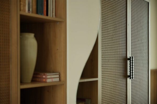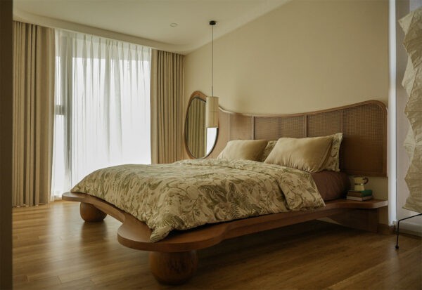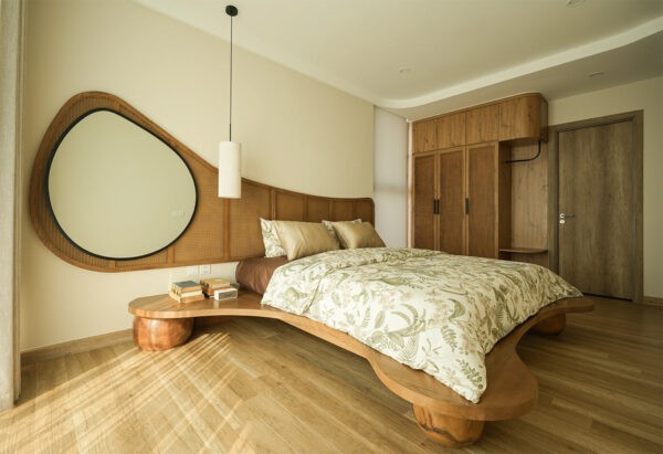 Nestled within the home’s serene embrace, the bedroom marries the softness of nature-inspired textiles with the robust charm of mid-century craftsmanship. The room’s centerpiece, a curvaceous, wooden platform bed, flows like a gentle wave, complementing the oversized, asymmetrical mirror that anchors the space in a dance of organic forms.