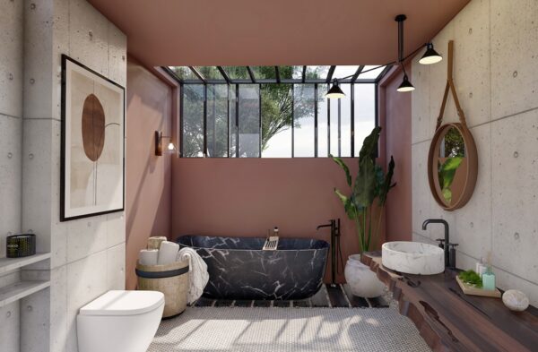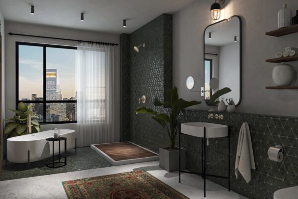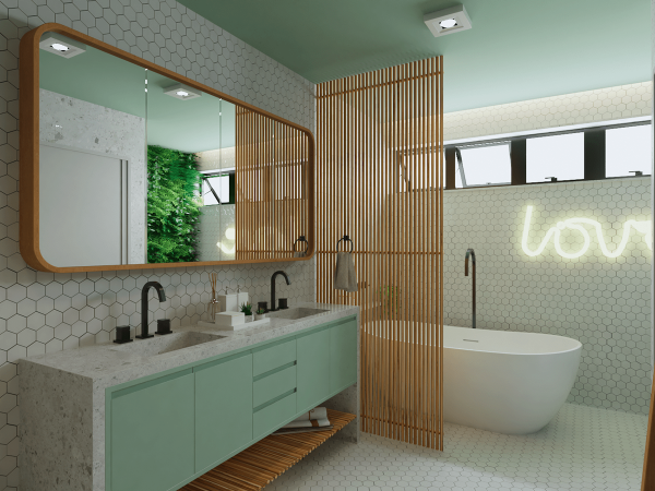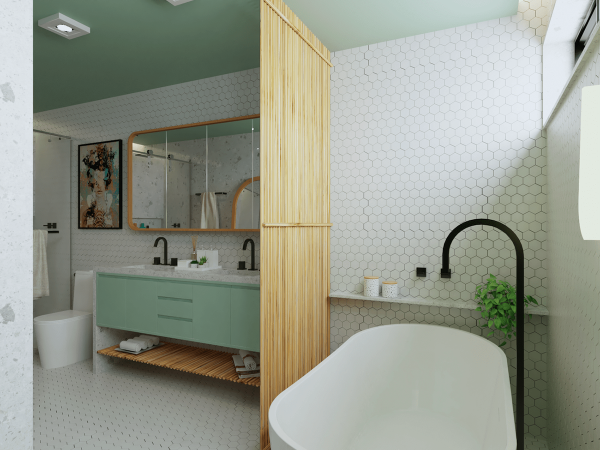 Mint green accents give this minimalist boho bathroom concept a fresh feel. A bamboo screen lightly divides the tub area from the basins.