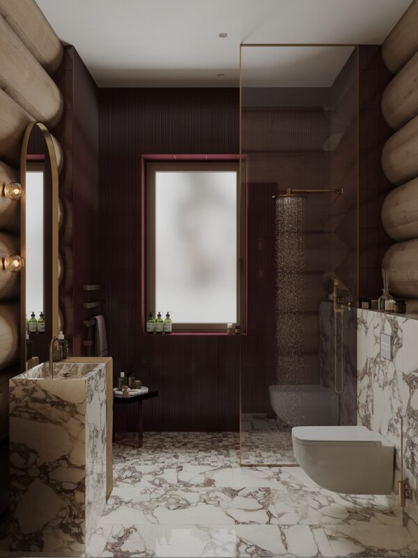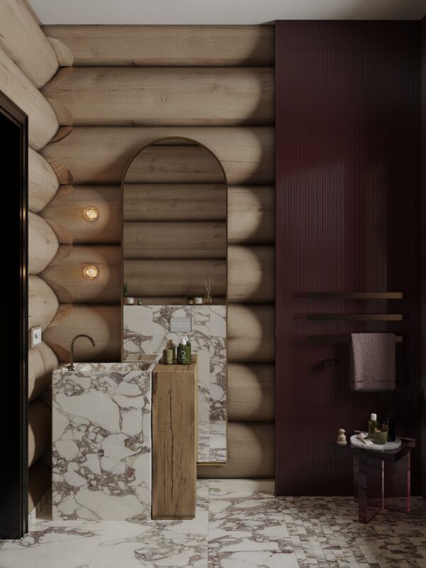 Maroon tiles splash color against the natural foundation. An arched full-length mirror and a pedestal sink form a layered composition.