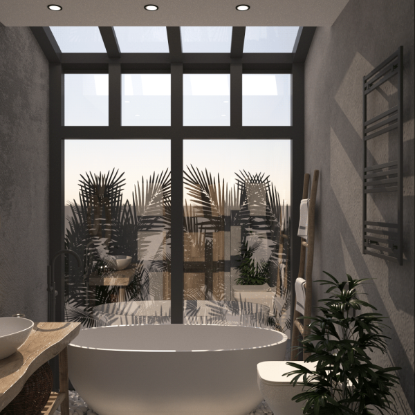 Screen your boho bathroom from prying eyes behind privacy plants on the balcony or a window decal of the same botanical vein. In this example, the bathroom window folds into a skylight so the homeowner can take a soak under the stars.
