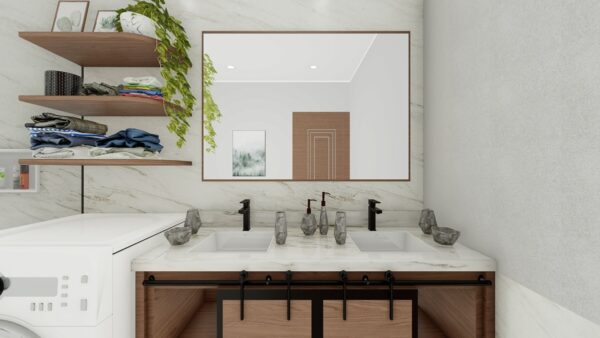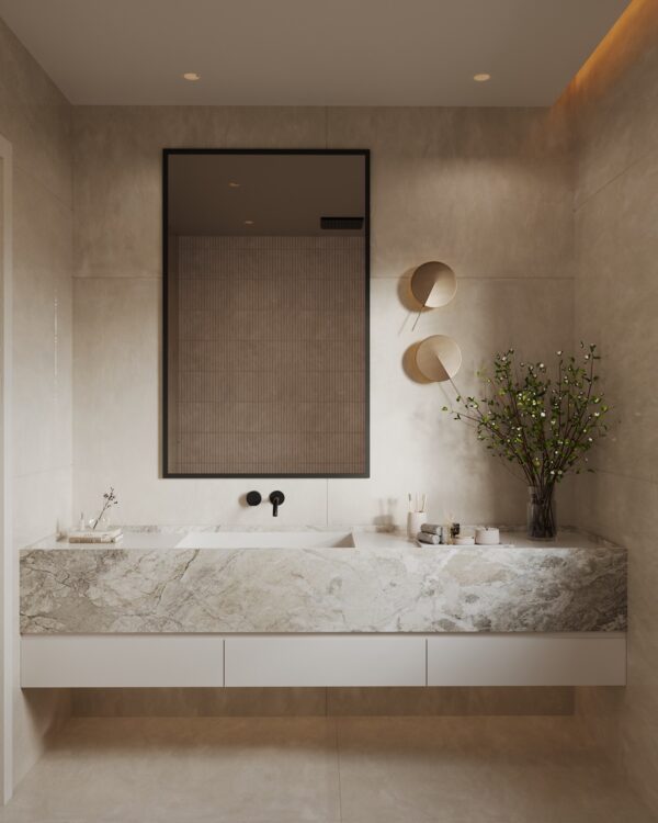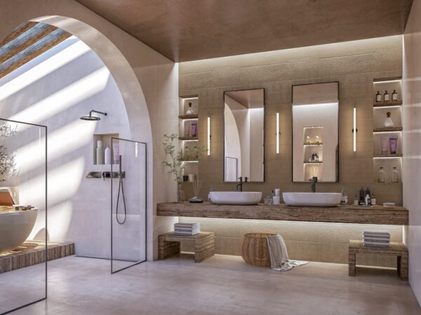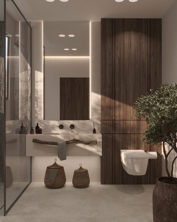Clean-cut lines achieve a minimalist boho aesthetic here. A linear vanity unit is raised from the floor to increase the sense of space.