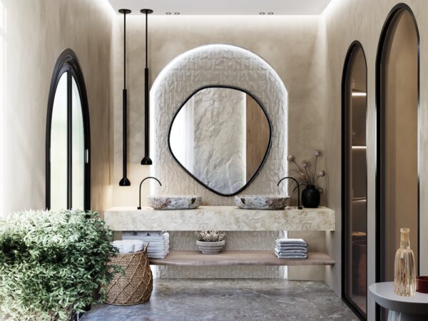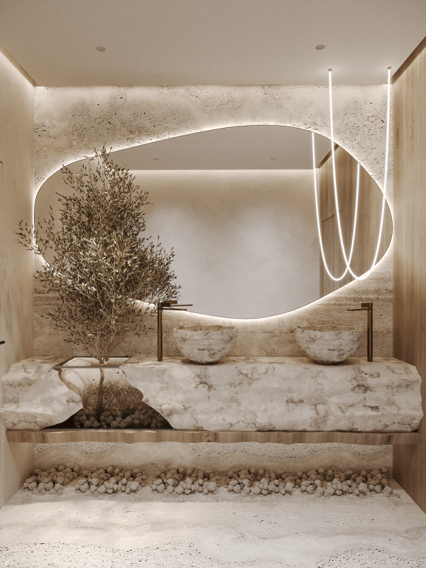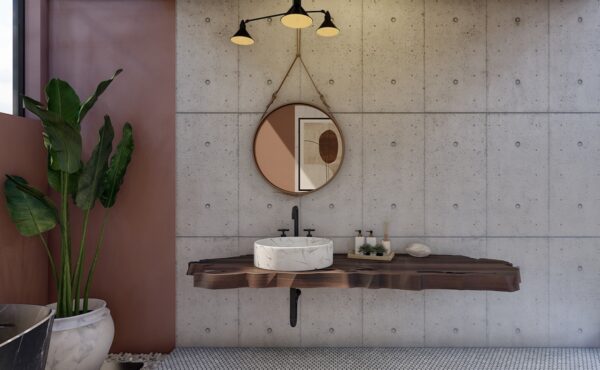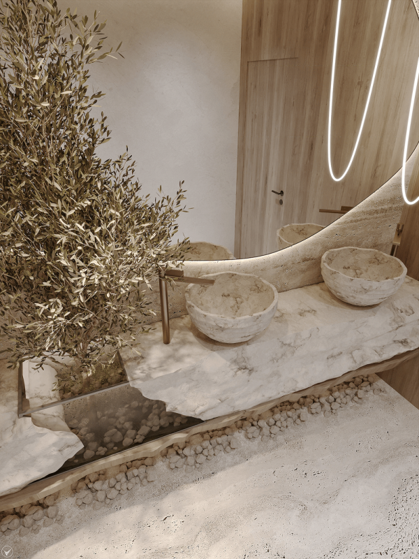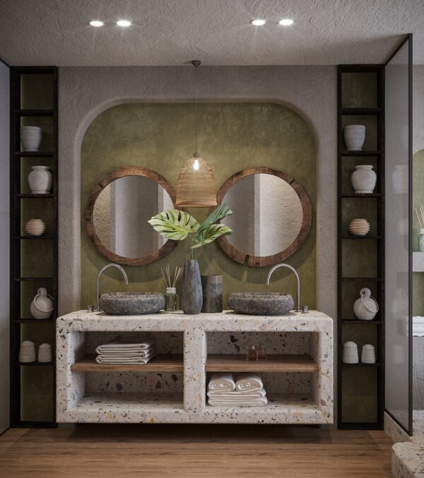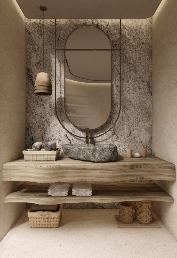 Go all out with a deeply textural experience. Install a stone backsplash wall with a rugged stone bathroom basin. Choose live-edge wooden furniture over straight and sleek alternatives, and sprinkle in rattan accessories.