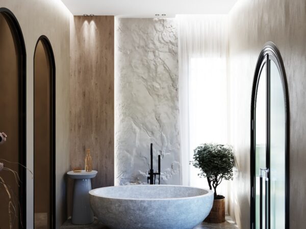 Different wall textures bring a bathroom concept to life, think smooth wood, tactile stone, and romantic window voile. Here, a stone bathtub is teamed with a glossy side table and tinted glass carafe to continue textural and tonal interest.