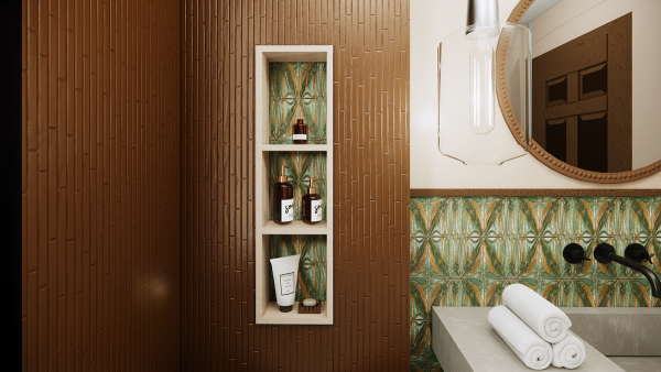 This rich boho bathroom design delivers warmth and texture through golden brown, reeded wall tiles and complementary green counterparts. The bamboo-like brown tiles form a cocoon of color around a modern freestanding bathtub, contrasting its fresh white finish. The green tiles call attention to a cool, concrete bathroom vanity.