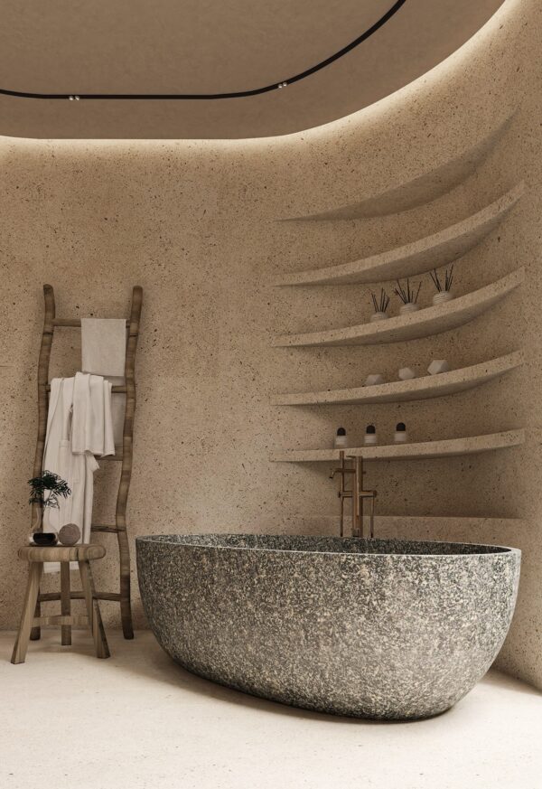 A small wooden stool makes an ideal partner for a striking stone bathtub design. Round out room corners and wall shelves to sculpt a truly unique space.