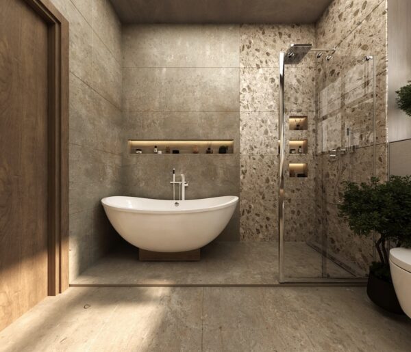 An all-gray boho bathroom decor scheme sets a moody stage with a masculine edge. Two different tile finishes define the shower area from the relaxing bathtub zone. Recessed lighting has been used to inject warmth.
