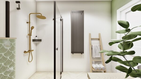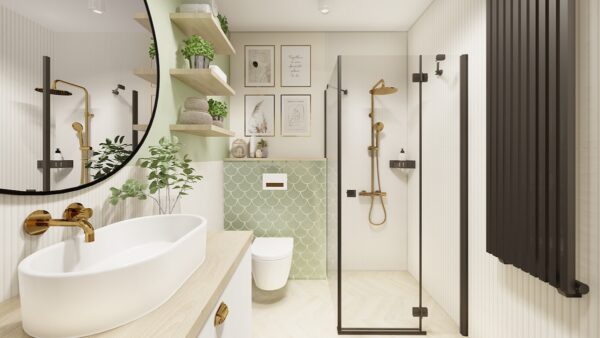 Soft shades of green go hand in hand with the modern boho bathroom aesthetic. Team with clean white pauses, pale wooden elements, matt black anchor points, and brass fittings for a serene yet contemporary result.