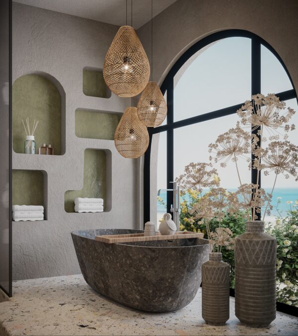 Rattan pendant lights are gathered into an attention-grabbing group of three. Recessed shelves carve softly rounded shapes into the wall stucco.
