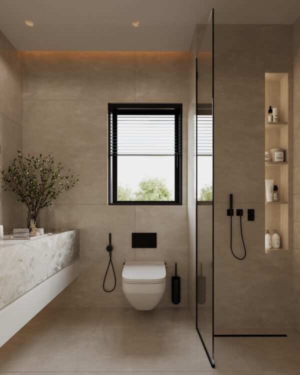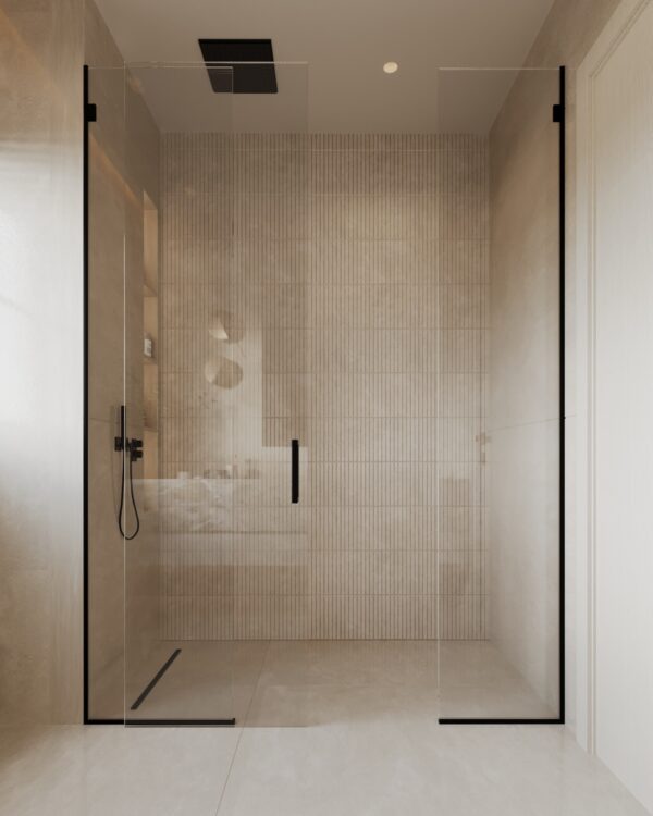 A rainfall shower head is tucked into the ceiling to complete the streamlined finish.