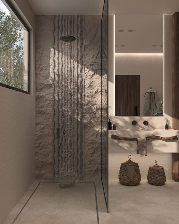 Inside the shower area, a stone-clad wet wall creates an outdoor feel.