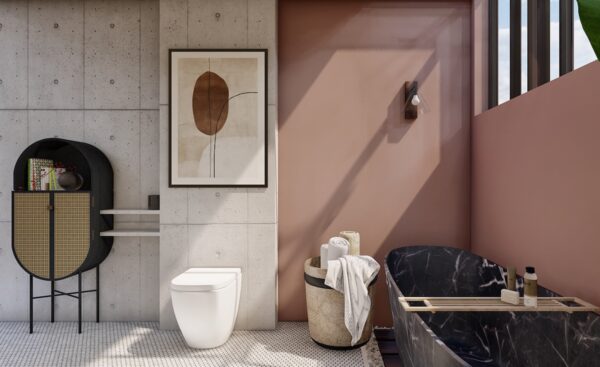 Modern wall art elevates the toilet cistern concealment chamber, against a background of industrial concrete.