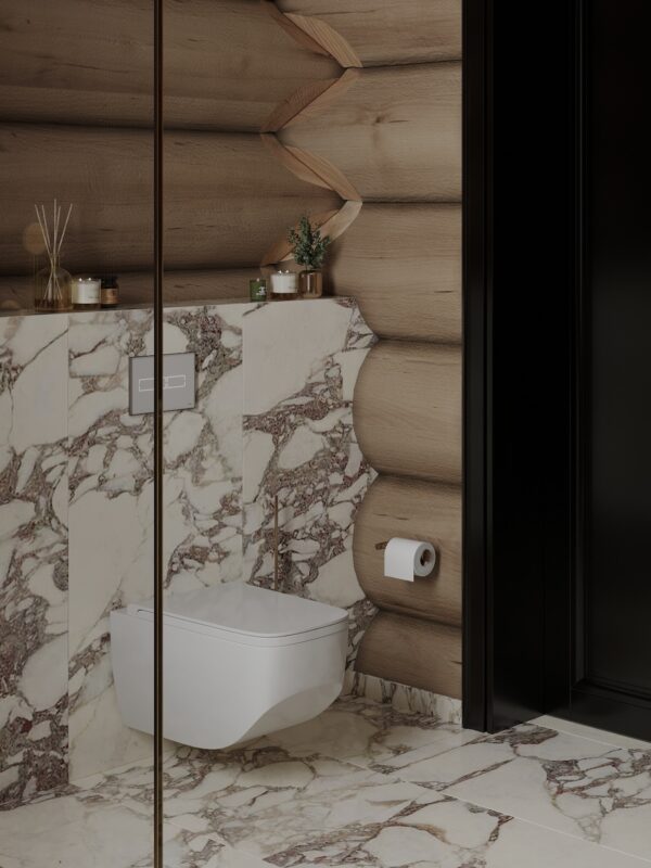 Log cabin-style walls create a heavy juxtaposition with sleek white marble cladding in this WC.