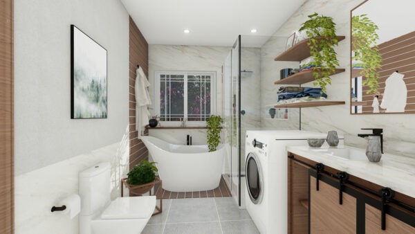 This family-oriented boho style bathroom has a laundry area to help with the daily to-do list. Open shelves accommodate a mix of practical and decorative items.