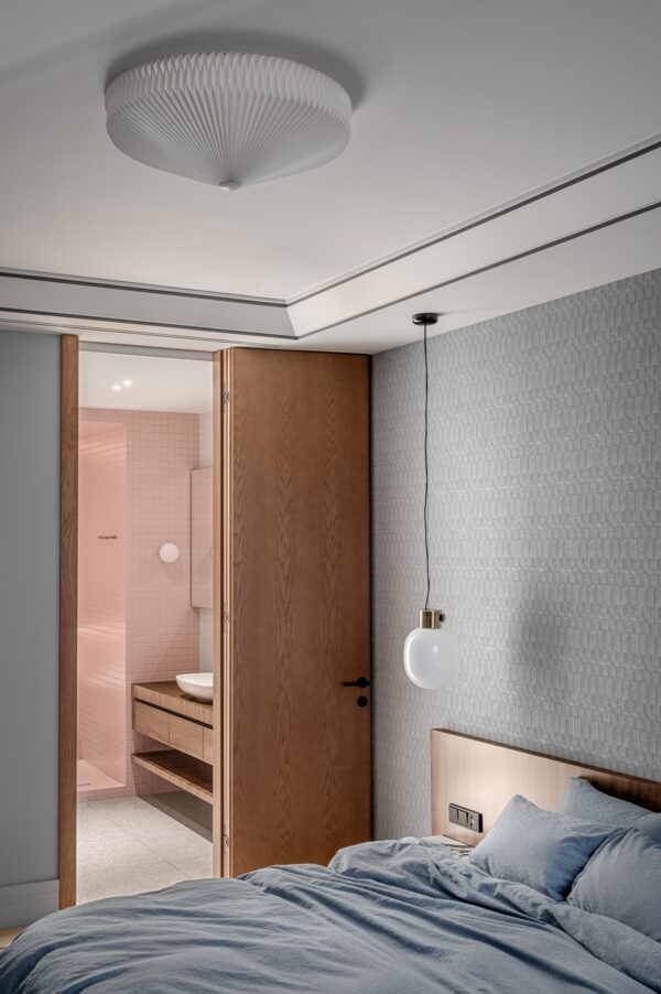 The master ensuite has a soft pink aesthetic, which glows warmly through the doorway of the cool gray master bedroom.