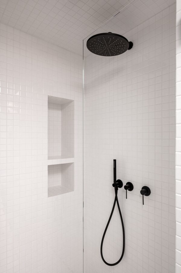 Recessed shower shelves are on hand to receive soap and lotion dispensers.