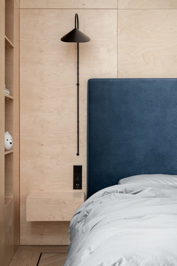 Floating bedsides appear to extrude from the wood cladding. Display shelves are set back into the timber to continue the simplified concept.