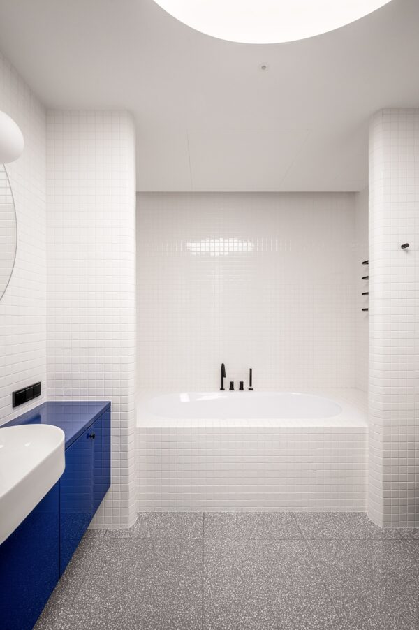 The first bathroom we stumble upon downstairs is clad edge-to-edge with white mosaic tiles. They wrap curved walls that flank a fitted bathtub, creating a tactile frame.