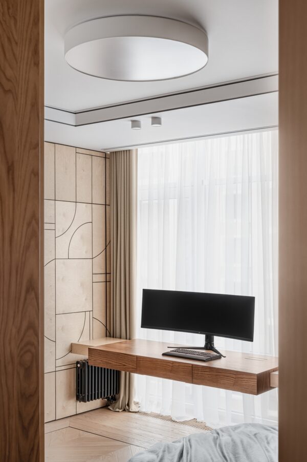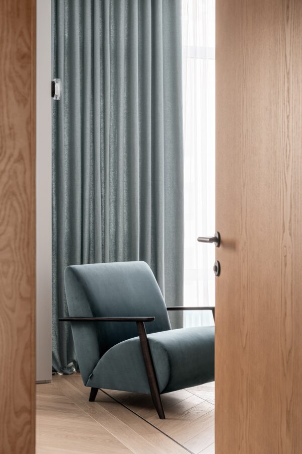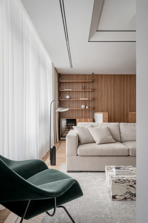 We begin our tour in the living room of this modern apartment in the center of Kyiv. A dark green velvet accent chair injects the first shot of color against a background of fresh white paintwork. A modern fireplace brings in a cozy glow underneath the wall-mounted TV.