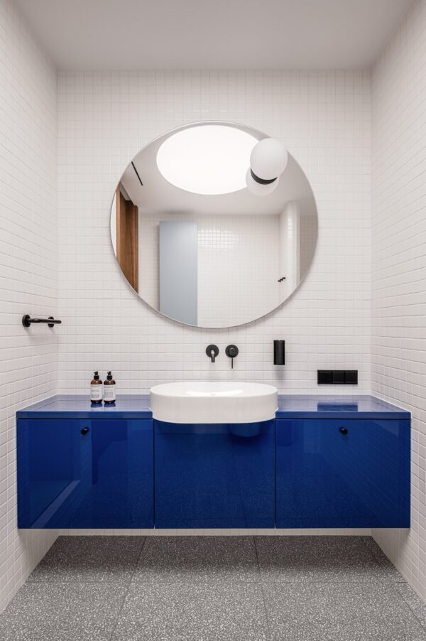 A bright blue bathroom vanity unit adds a shocking stripe of color to the predominantly white bathroom decor scheme. Black bathroom faucets, fittings, and matching light switches complement the modern vibe. A round bathroom mirror fills the wall.