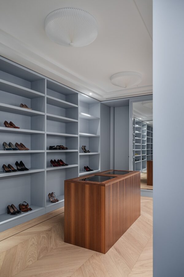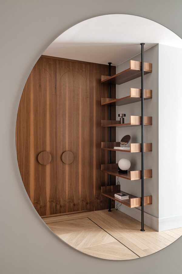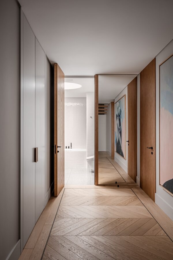 The same parquet flooring runs throughout the apartment to achieve a cohesive finish. Dark edging calls attention to the boundary of each zone.
