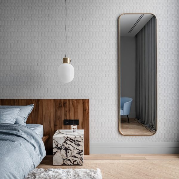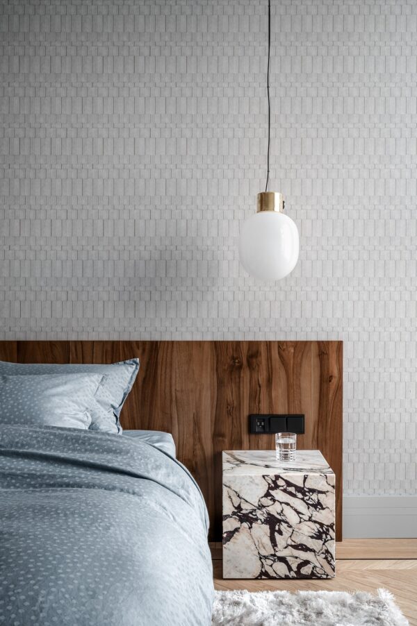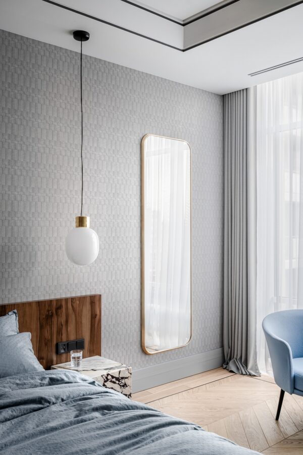 In the master bedroom, textured, silver-gray wallpaper covers the headboard feature wall with a subtle pattern. A wooden headboard provides dark contrast.