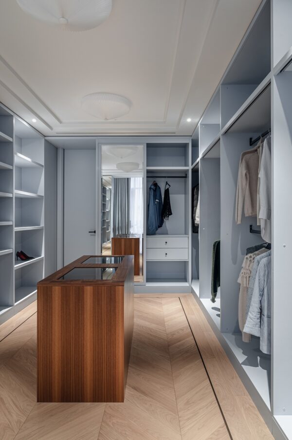 Hidden behind closed doors, a walk-in closet unfolds. The walk-in closet organizers are colored a soothing blue-gray tone that makes cool contrast with a warm wood closet island.