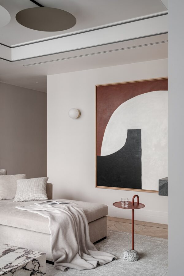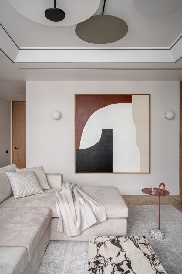 The white marble coffee table introduces a striking moment of dramatic black veining into the center of the light living room design.