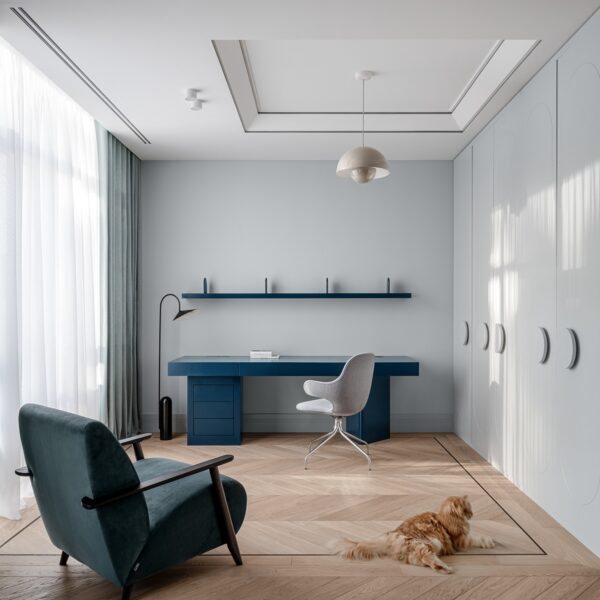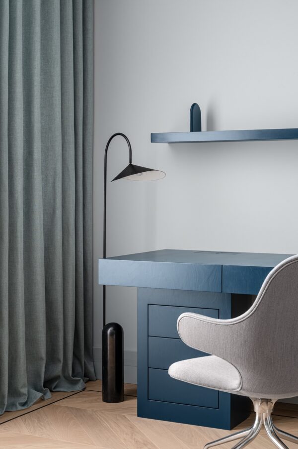 In the modern home office, a navy blue desk and matching blue shelf are teamed with a smart gray desk chair.