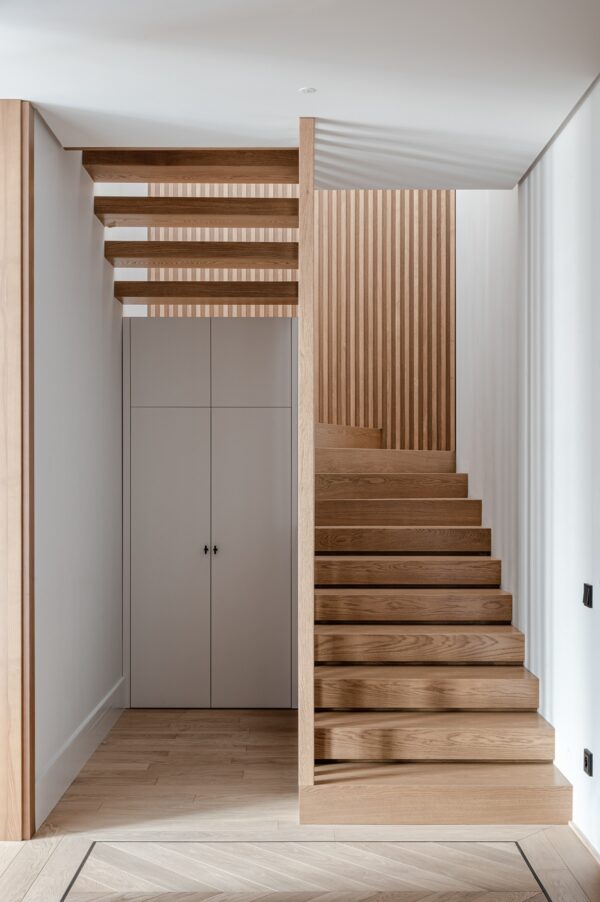 The modern staircase design features heavy wooden treads with a gently floating effect, which is achieved by a slight recess in the riser.