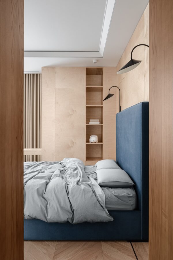 This teenager’s bedroom design receives color in the form of a navy blue upholstered bed. Custom-made closets are constructed in light wood.