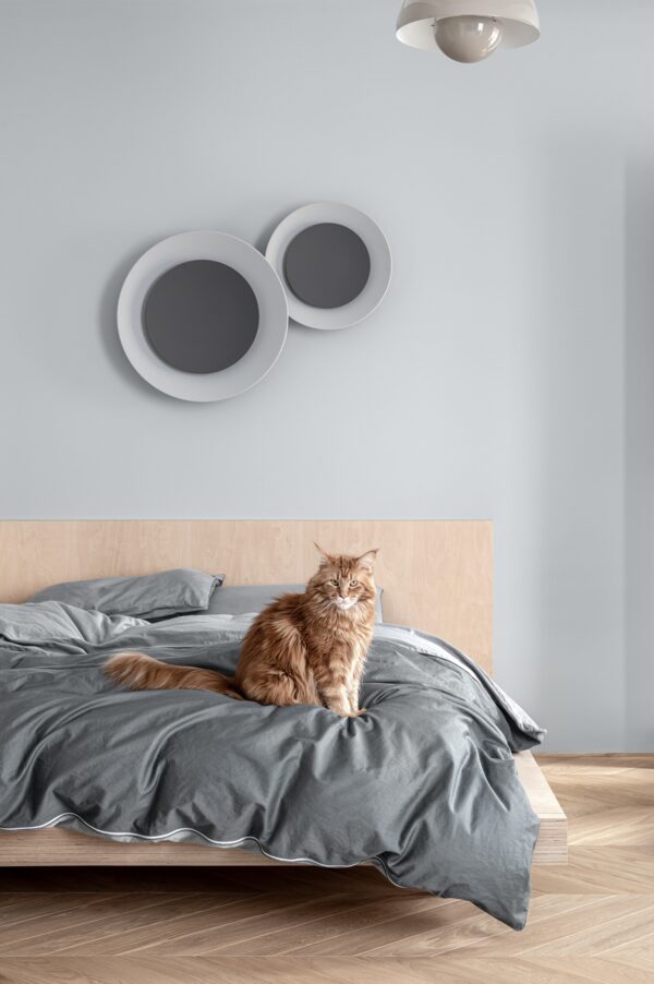 The final bedroom has a minimalist gray palette with light wood accent furniture.