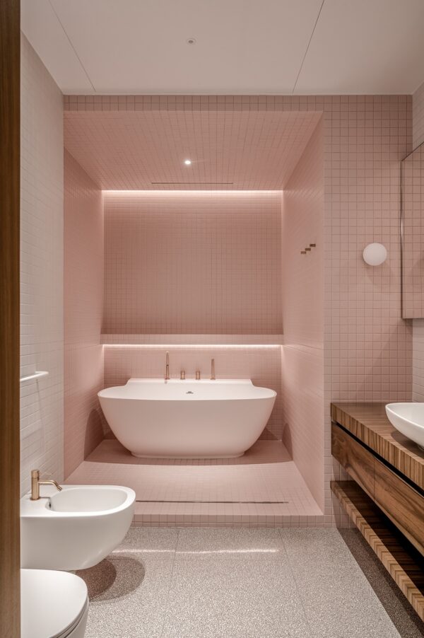 Soft pink mosaic tiles engulf the bathtub area, covering the flanking walls, the ceiling, and the raised floor beneath. The tiles cover a floating shelf above the bath, where a concealed LED light strip illuminates an elegant gold faucet below.