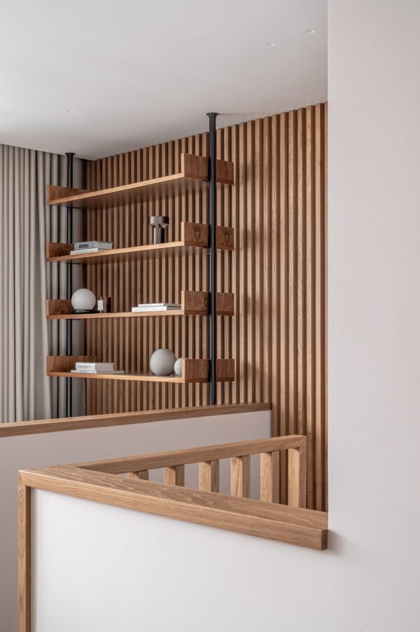 A wood-slatted feature wall defines the small home bar area, stopping just short of the open stairwell. Wooden balustrades complement the living room material palette.