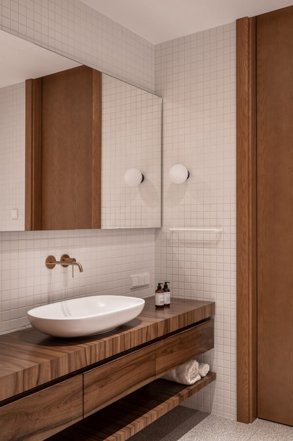 A chunky wooden vanity unit balances out the sweetness of the pink aesthetic and the dainty mosaic tiles.
