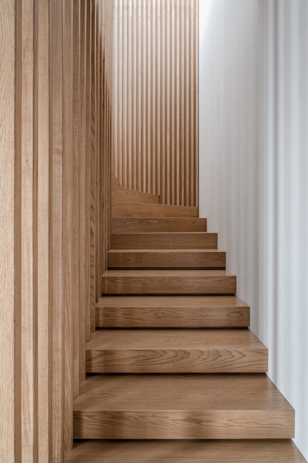 Wooden risers stretch from tread to ceiling to fashion a custom design. Natural light plays through the bars, casting shadow play upon the white walls.
