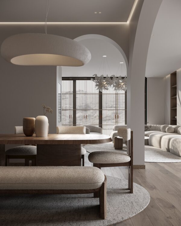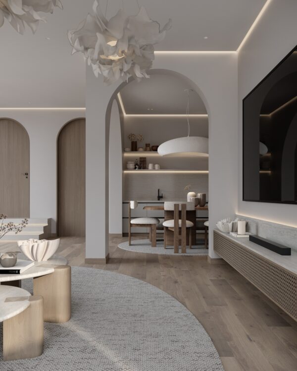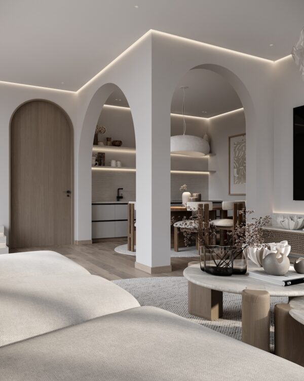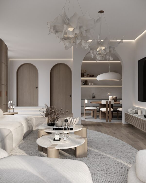 In Saudi Arabia, we discover an elegant apartment filled with neutral cozy living room ideas. Archways give the open-plan living space an intimate atmosphere.