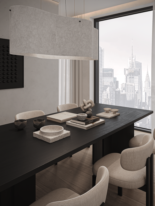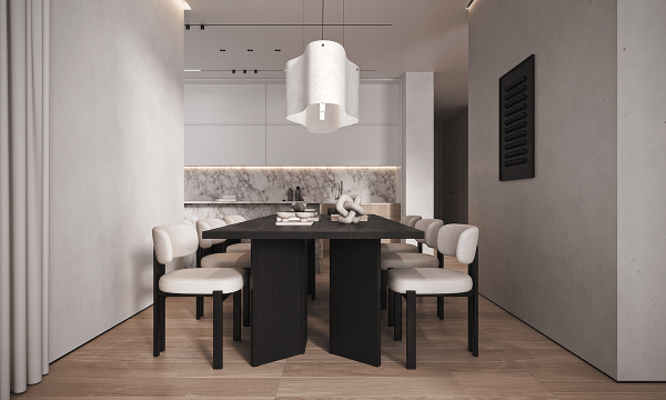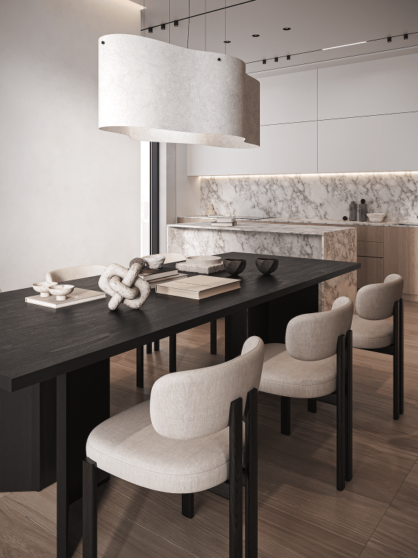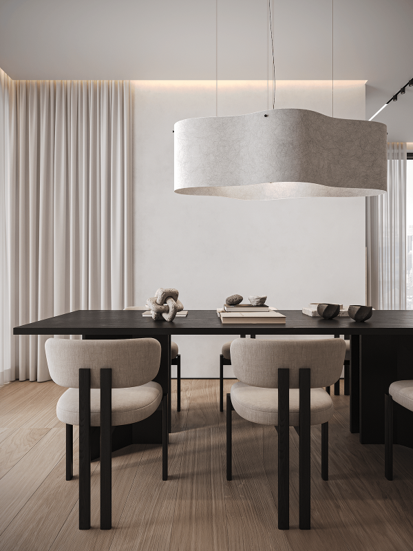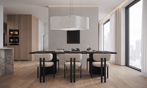 Behind the media wall, there is an adjoined kitchen and dining area. In the dining room, a huge, statement pendant light is suspended low over the black dining table. Its huge profile spans much of the six-seater table, spreading even illumination.