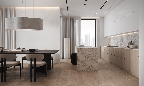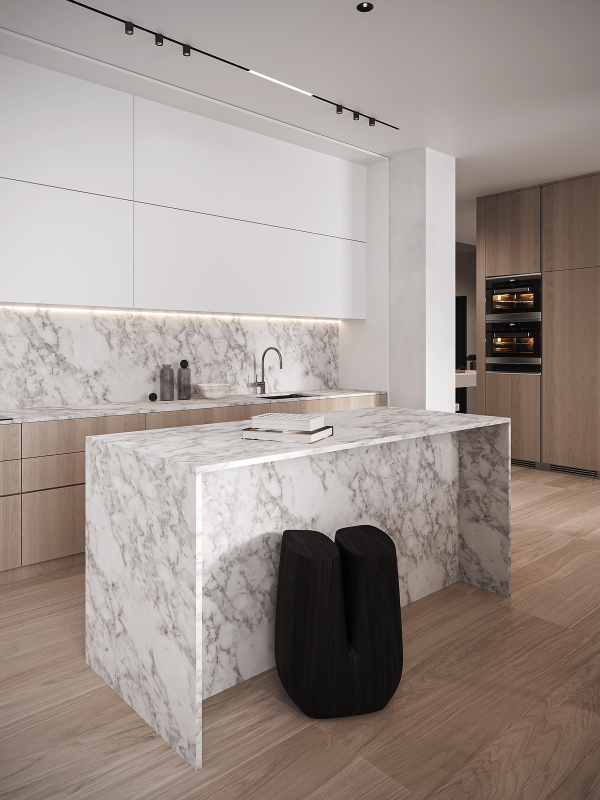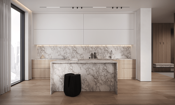 The clean-cut kitchen arrangement has a distinctly luxurious essence. Sleek white marble clads the backsplash wall and drapes the central kitchen island with a waterfall countertop. White kitchen wall cabinets keep a clean visual up top while wooden base units merge with the matching flooring.